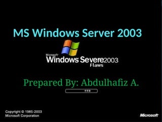 This document provides a comprehensive overview of Windows Server 2003, including its various editions and configuration guidelines. It covers setup instructions, server roles, Active Directory concepts, and installation procedures, along with user management and Group Policy configurations. Additionally, it discusses components such as IIS and FTP services, detailing their functionalities and command usage.