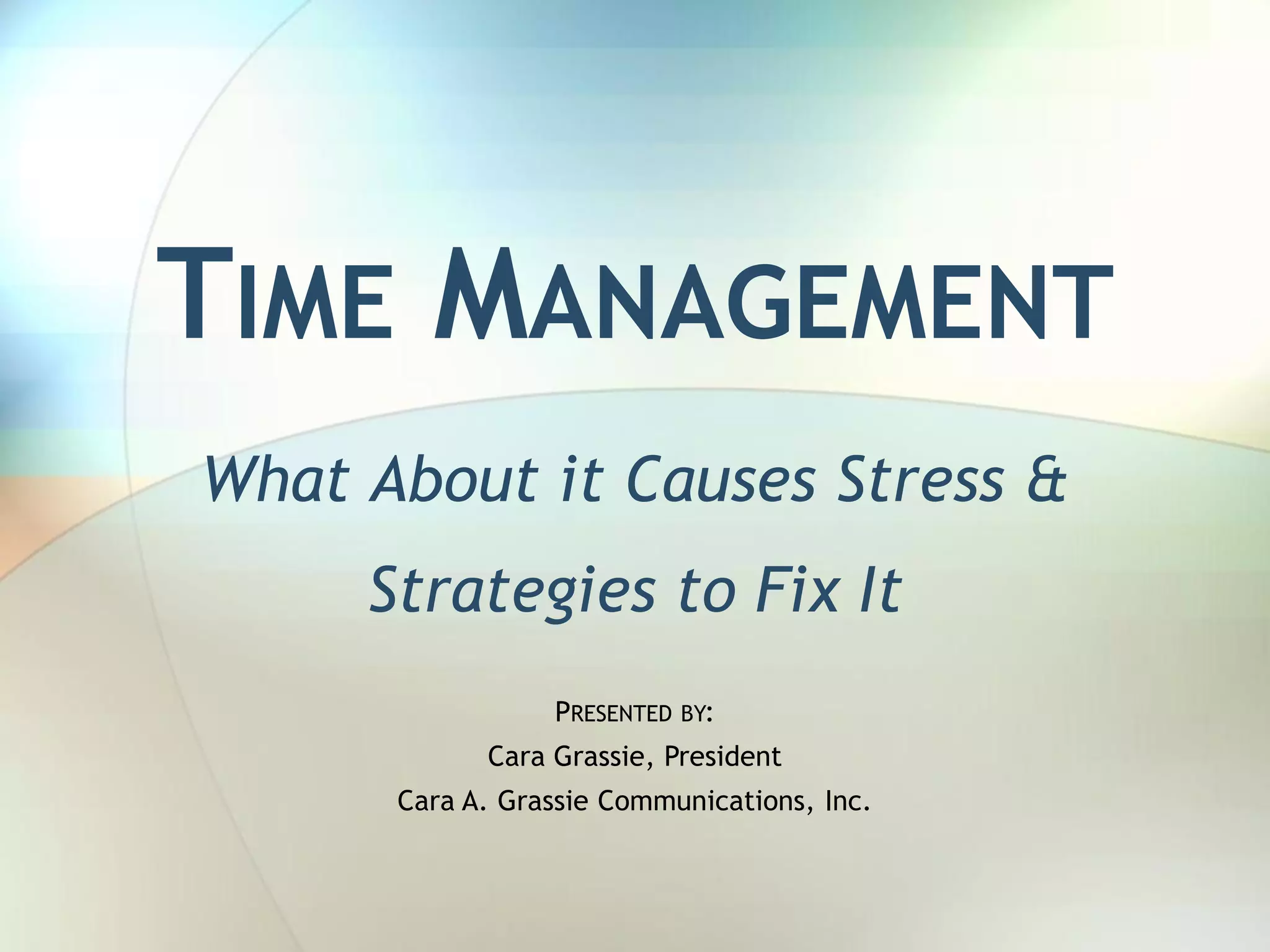 The document discusses strategies for managing time effectively to reduce stress. It identifies common "time bandits" like social media and breaks that waste time. Effective time management techniques are presented, including prioritizing tasks, saying no to nonessential work, focusing on quality over quantity, using a 10-minute rule, and monitoring time usage. The importance of a healthy lifestyle to improve efficiency is also emphasized.