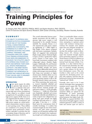 This document discusses training principles for developing power in athletes. It defines power as the rate of doing work, which is calculated by multiplying force by velocity. There are three key factors that influence power output: maximal strength, rate of force development, and the ability to generate force at high velocities. Stronger athletes are typically able to express higher power outputs. A minimum back squat strength of 2 times body weight is recommended before specialized power training. Both heavy strength training and explosive exercises can improve rate of force development, but heavy training is better for increasing maximal strength while explosive exercises may optimize rate of force development in stronger athletes. A mixed training approach is often best for maximizing power development.