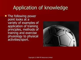 This document provides examples of how to apply training principles and exercise physiology concepts to specific sports and physical activities. It uses basketball, rugby, running, and water polo to demonstrate specificity, components of fitness, energy systems, patterns of joint coordination, and the FITT principle. For each concept, requirements for the different positions in rugby and components of training programs over the season are discussed at a high level.