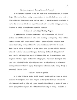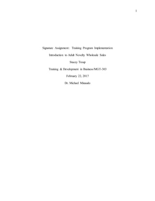 1. The document outlines a training program for new employees in the adult novelty wholesale sales industry. It covers 4 steps: team assignments, interactive product training, a company overview, and conclusion/feedback.