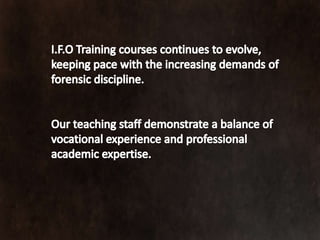 This document describes 8 forensic training courses ranging from 8-18 hours each. The courses cover topics like identifying and documenting bloodstain patterns, forensic signature authentication, crime scene investigation, crime scene management, trace evidence examination, forensic toolmark analysis, and forensic entomology for crime scene investigators. Each course description provides an overview of what participants will learn to help professionals handle fraud detection, risk management, and forensic investigations.