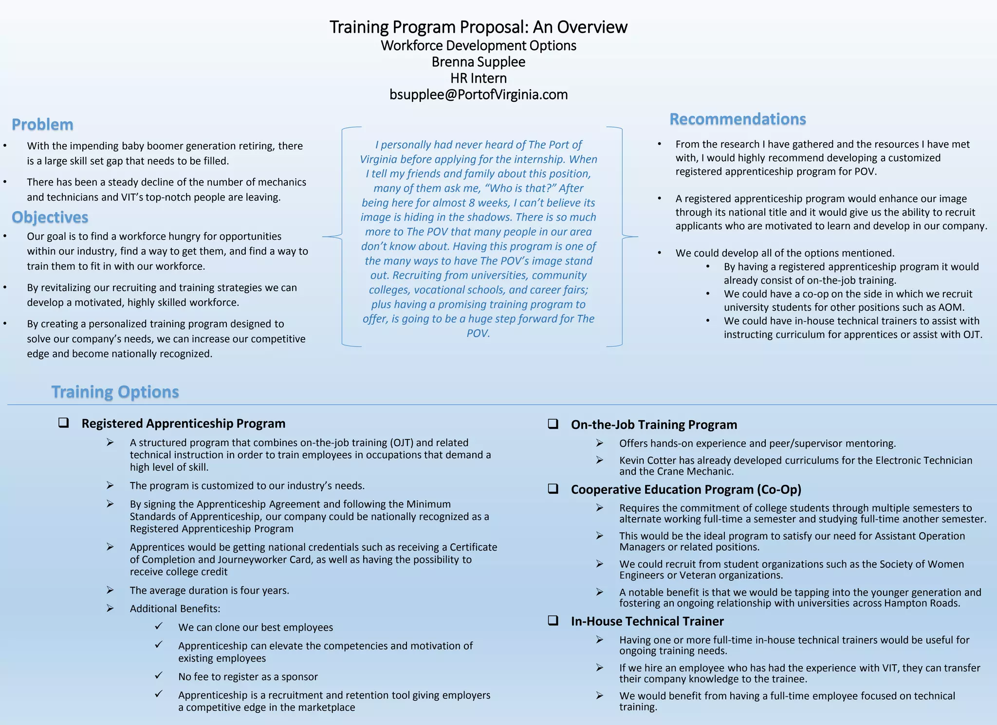 The document proposes creating a customized training program to address the Port of Virginia's (POV) impending skills gap due to retiring workers. It recommends developing a registered apprenticeship program combining on-the-job training with technical instruction to train new employees. The apprenticeship program would enhance POV's image and allow it to recruit motivated applicants while developing all employees' competencies. It also suggests supplementing this with a cooperative education program for assistant managers and in-house technical trainers.
