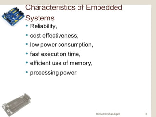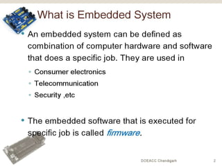 This document provides an overview of microcontrollers and embedded systems. It discusses characteristics of embedded systems and integrated circuits used in processors. It also describes challenges in embedded system design and common microcontrollers like the 8051. Examples are given of interfacing components like seven segment displays, keypads, and LCDs to microcontrollers. Finally, an example project is outlined for an electronic code lock using a microcontroller and password input from a keypad.