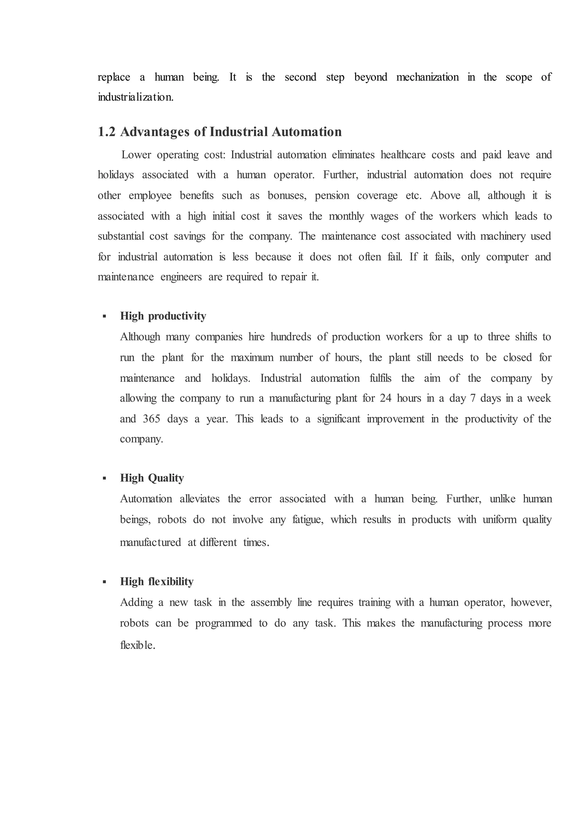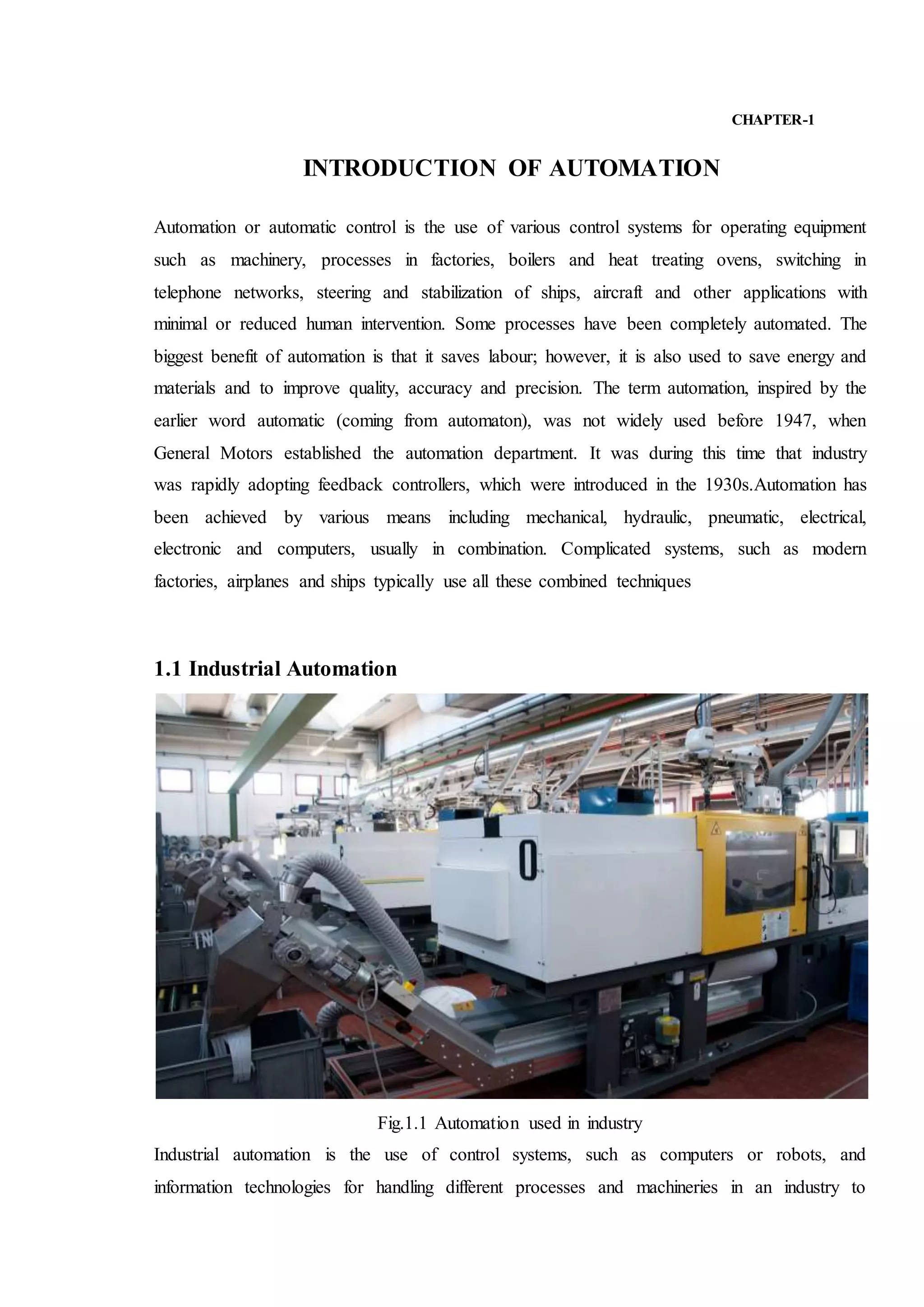 The document discusses automation, focusing on its definition, advantages, and the concept of industrial automation, which uses control systems to replace human operators in production processes. It also delves into Programmable Logic Controllers (PLCs), outlining their evolution, architectural components, and operating cycles, highlighting their role in improving efficiency and reducing costs in manufacturing. Finally, the text explains programming devices and software used for PLCs, reflecting on their significance in the automation landscape.