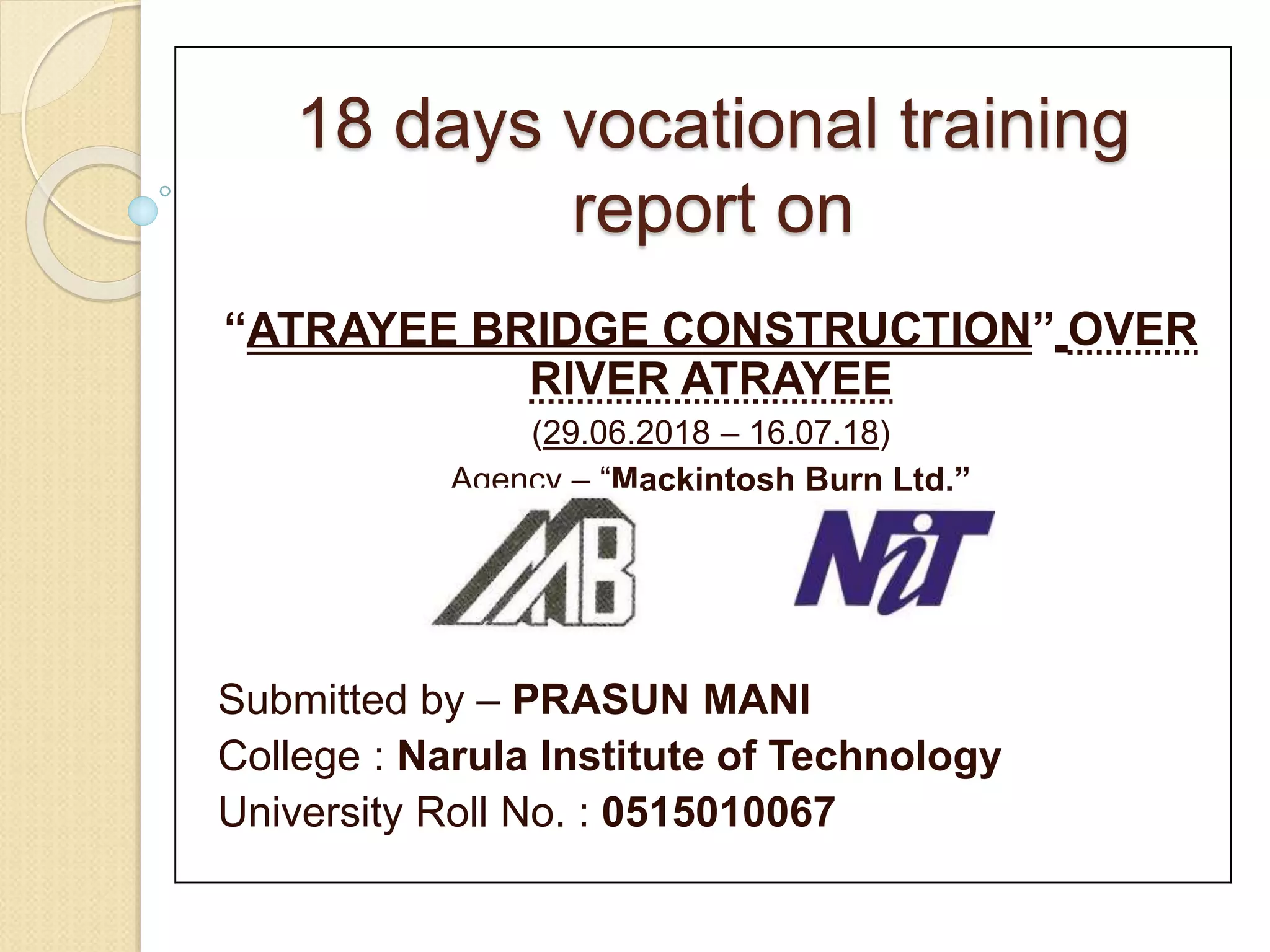 The document is a vocational training report on the construction of the Atrayee Bridge over the Atrayee River in West Bengal, conducted from June 29 to July 16, 2018, by Prasun Mani from Narula Institute of Technology. It highlights key aspects of the project, including safety measures, survey techniques, materials used, and the roles of various engineering teams involved in the construction. The report reflects on the learning experience gained during the training, emphasizing teamwork and overcoming engineering challenges.