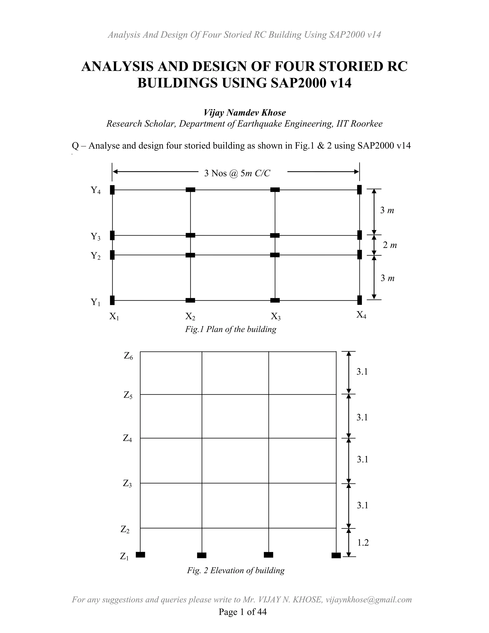This document provides instructions for analyzing and designing a four-storied reinforced concrete building using SAP2000 v14 software. It describes the steps to create the model, including defining materials, frame sections, adding frame objects and restraints. The building details such as dimensions, grades of concrete and steel, loadings are also specified. Detailed procedures are given to model the columns, beams, apply supports and modify column orientations.