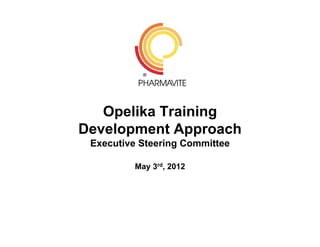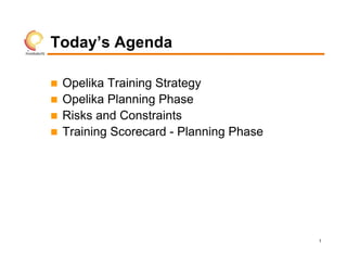 The document provides an overview of the training strategy and planning for the Opelika site. It outlines the key phases of planning, development, implementation and sustainment of training. It details the course development plan, risks around construction timelines and hiring waves, and a scorecard to track progress. The goal is to complete priority 1 training for startup production and packaging lines by the end of 2012.