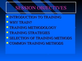 The document discusses training techniques and methods. It covers topics like learning, training needs analysis, training objectives, approaches to training, factors affecting choice of methods, and common methods like lectures, discussions, and case studies. The objectives are to introduce training, explain why training is needed, and discuss methodology, strategies, and selection of training methods.