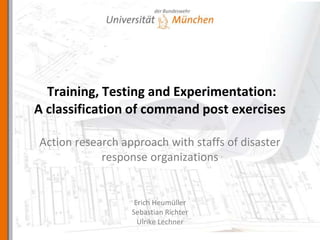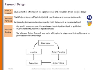 The document outlines a research project aimed at developing a framework for designing and evaluating command post exercises in disaster response organizations. It discusses challenges encountered during exercises, the need for defined performance criteria, and the importance of an organized evaluation methodology. The research culminates in a guide to support practitioners in achieving effective and goal-oriented exercise designs.