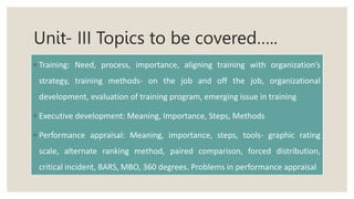 The document outlines key topics in training and development, emphasizing the importance of training for employee efficiency, skill enhancement, and organizational alignment. It covers various aspects of executive development, performance appraisal methods, compensation structures, and social security benefits. The document also highlights the necessity for effective training processes and the evaluation of managerial performance in response to changing organizational needs.