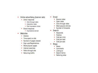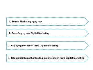 Tài liệu trình bày tổng quan về marketing số cơ bản, bao gồm các công cụ, chiến lược và tiêu chí đánh giá thành công. Nó nhấn mạnh tầm quan trọng của nghiên cứu thị trường, quảng cáo trả phí, tối ưu hóa công cụ tìm kiếm và marketing trên mạng xã hội. Ngoài ra, tài liệu cũng đề cập đến SMS và email marketing như công cụ hiệu quả để thu hút và giữ chân khách hàng.