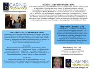 This document provides information about dementia care provider training offered by Caring Resources. The training aims to ensure care providers are able to meet the needs of those with dementia through standardized training programs, as cases of Alzheimer's disease and related dementias continue to rise. The curriculum provides both classroom learning and practicum experience, teaching innovative skills and strategies. Upon completion, participants will receive a certificate and be prepared for high-quality dementia care.