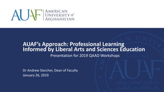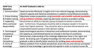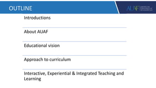 The document outlines AUAF's approach to education, which is informed by liberal arts and sciences traditions. It emphasizes interactive, experiential, and integrated teaching and learning. The curriculum focuses on developing general competencies through a core curriculum before specializing in majors. Learning outcomes are mapped from courses to programs to ensure integration. Teaching methods include discussion, group work, flipped classrooms, projects and case studies. Capstone courses integrate and assess prior learning through final projects.