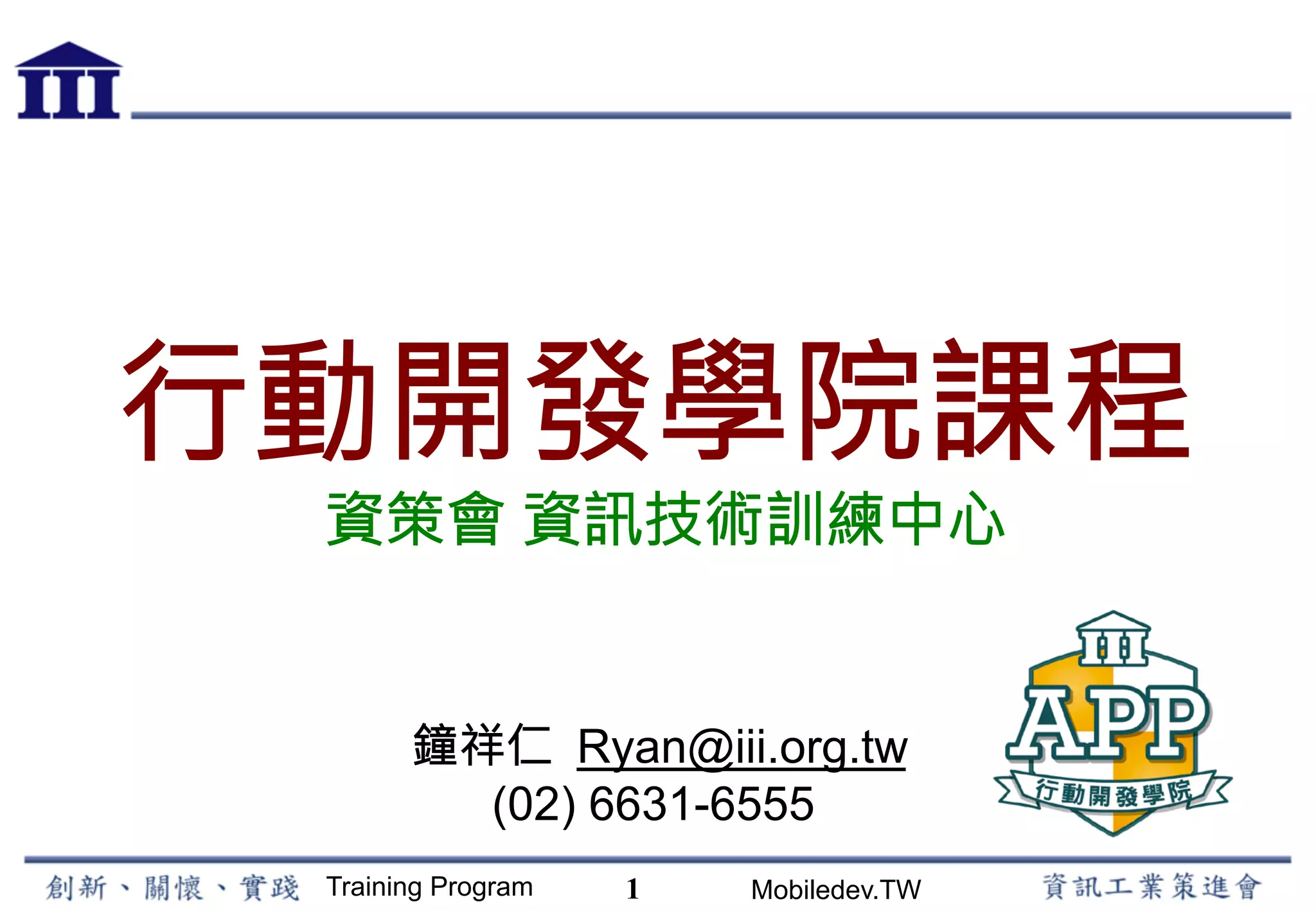 該文檔主要介紹了行動開發學院的課程與訓練計劃,包括iOS和Android的應用開發、使用者介面設計和企業內部上架方案。課程強調以實作為主,並由經驗豐富的講師進行教學,旨在培養學員的實際技能。文檔還提及課程的客製化選擇和學習支援服務。