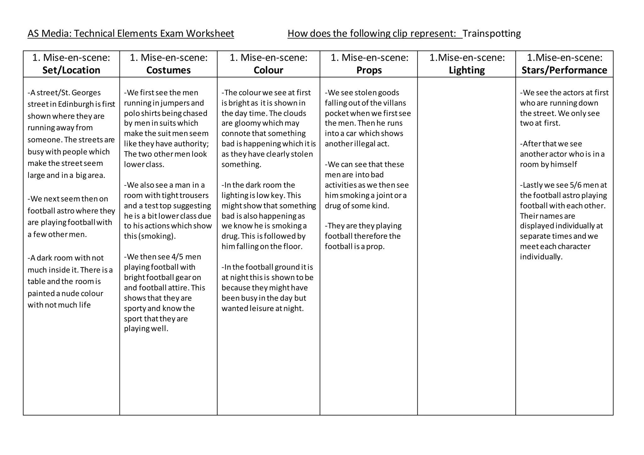 This document analyzes the technical elements represented in a film clip from Trainspotting including mise-en-scene, cinematography, sound, and editing. Mise-en-scene aspects analyzed include locations, costumes, colors, props, and lighting that establish characters as lower class and involved in illegal activities. Cinematography uses a variety of shots including mid-close ups, point-of-view shots, and low angles. The soundtrack includes upbeat rock music and a voiceover narrative, while sound effects convey running and shouting. Editing employs freeze frames to introduce characters, along with cuts and short shots to depict multiple scenes and events across different times and locations.