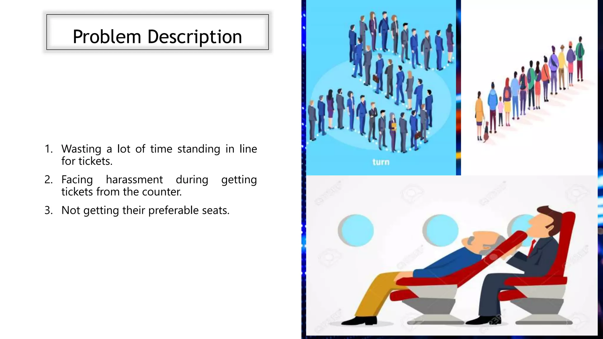 1) The document describes an online ticket booking website that allows users to book train tickets without needing to stand in long lines or face harassment at ticket counters.