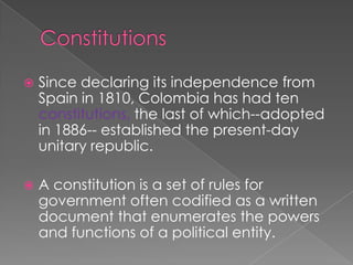 The document discusses Colombia's constitutions since independence from Spain in 1810. It notes that Colombia has had ten constitutions, with the current constitution established in 1886. The constitutions addressed the division of powers between branches of government, the strength of the executive branch, and the role of the Roman Catholic Church. The constitutions also dealt with issues like central government versus federalism, civil liberties, and political rights.