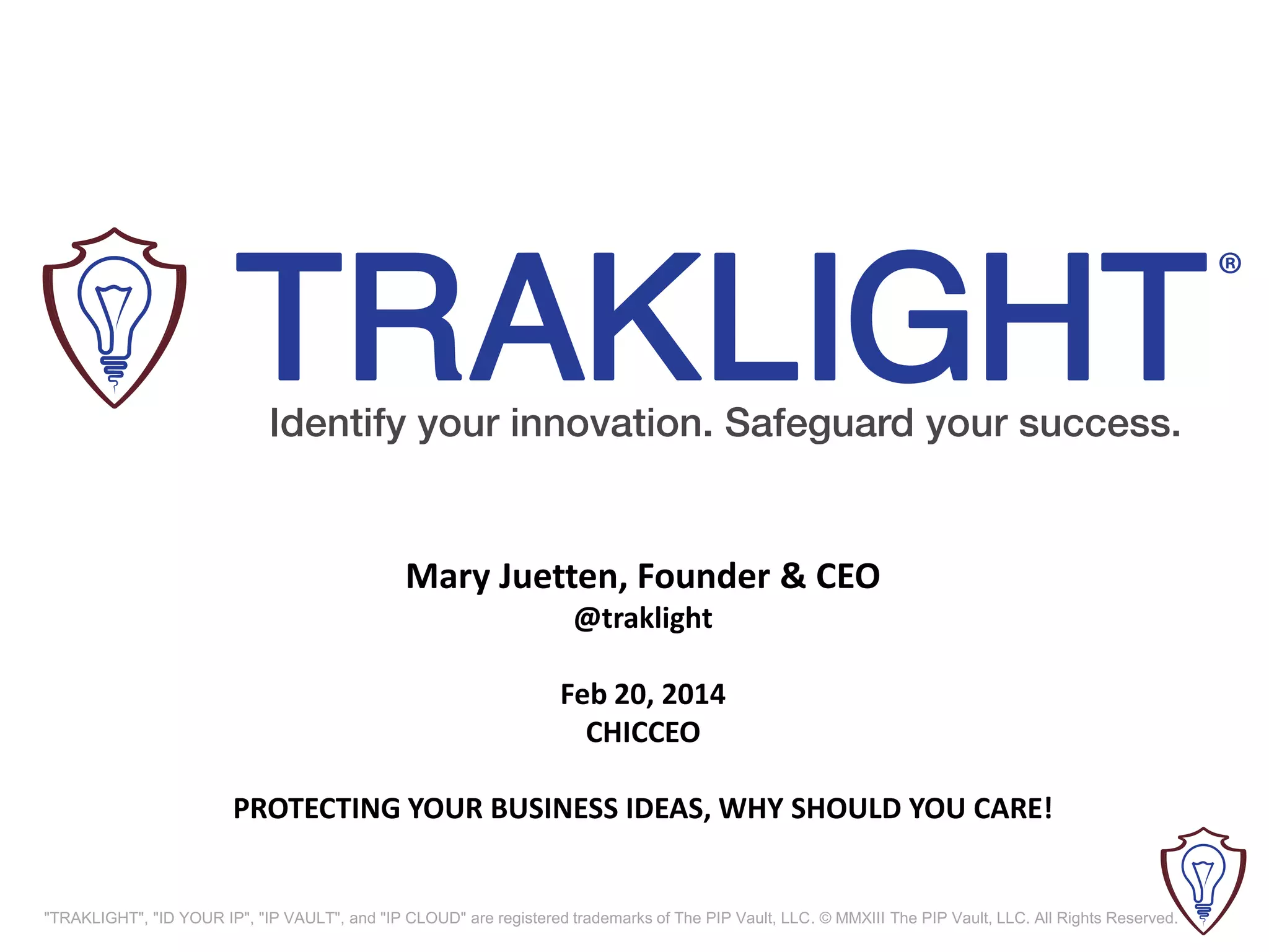 This document discusses the importance of protecting intellectual property for entrepreneurs and startups. It notes that IP theft costs US companies $250 billion annually and that while 100% of companies have IP, only 20% of startups protect their IP after the first year. The document encourages entrepreneurs to identify and protect their intellectual property through trademarks, patents, copyrights, and trade secrets in order to exclude competition, attract investment, and avoid IP loss or infringement that could lead to business failure. It provides examples of different types of IP and strategies for protecting IP, such as hiring professionals or using free online resources from the USPTO and Copyright office.