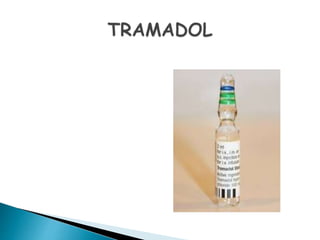 This document discusses opioid analgesics, focusing on tramadol and butorphanol. It defines opioids and their receptor types. Tramadol is described as a centrally acting atypical analgesic that is a racemic mixture with both enantiomers contributing to its analgesic effects. Its mechanisms of action and pharmacokinetics are outlined. Butorphanol is introduced as a synthetic agonist-antagonist opioid with greater agonist and antagonist effects than pentazocin. Its proposed mechanisms of analgesia and adverse effects are summarized. Clinical uses of both drugs for various acute and postoperative pain conditions are mentioned.