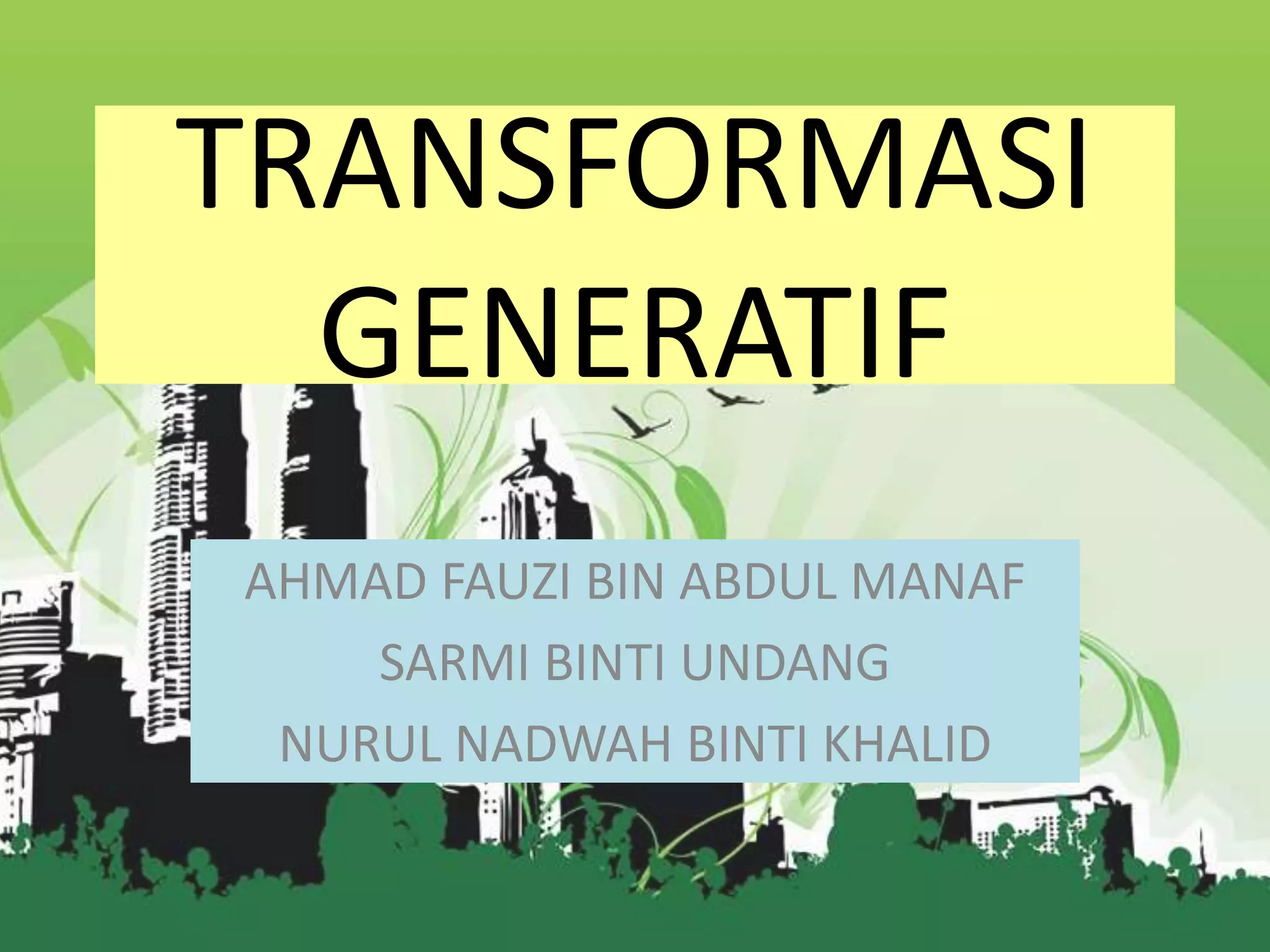 Teori transformasi generatif, yang diperkenalkan oleh Noam Chomsky pada tahun 1950-an, merupakan aliran baharu dalam linguistik yang menekankan kemampuan penutur asli untuk membentuk dan memahami pertuturan baru berdasarkan rumus-rumus tertentu. Teori ini menolak pandangan strukturalis yang menganggap bahasa sebagai kebiasaan, dan sebaliknya mendalilkan bahawa bahasa adalah warisan keturunan dan bersifat mentalistik. Analisis transformasi generatif bertujuan untuk merumuskan struktur bahasa yang dapat membantu individu yang tidak mahir dalam bahasa tersebut untuk membentuk ayat yang gramatis.