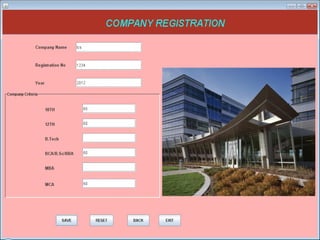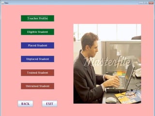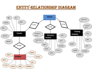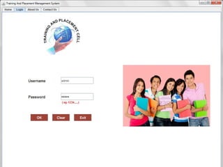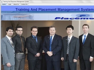 The document describes a Training and Placement Management System designed by a group of students to facilitate faculty in accessing student profiles and job placement statuses. It aims to streamline placement-related activities, maintain student details, and provide user-friendly operations, thereby saving time and reducing errors. The system utilizes Java and Oracle databases and includes functionalities for administrators, teachers, and students to manage their information and access relevant data.