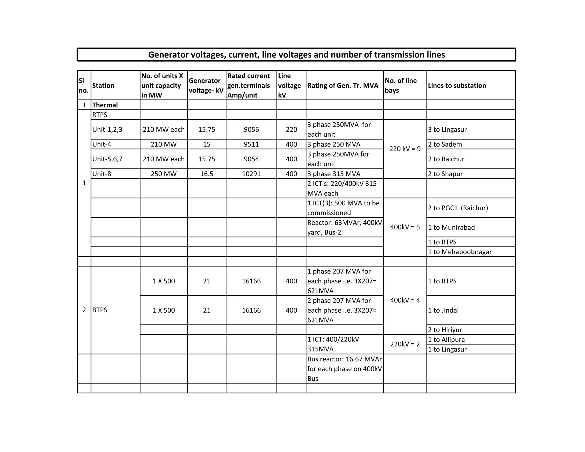 - Thermal power stations like RTPS with details on unit capacities, generator voltages and currents, transmission line voltages and ratings.
