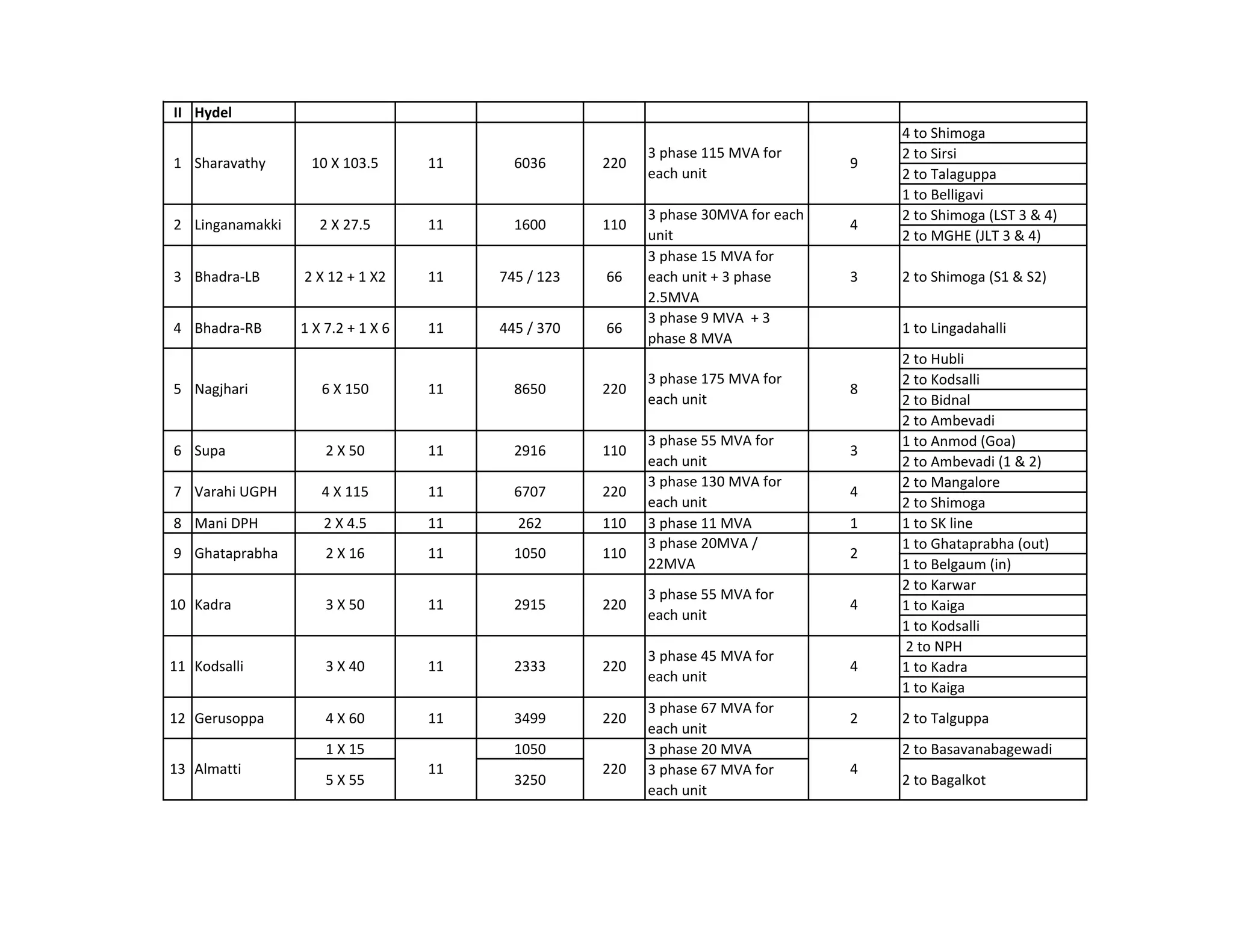 - Hydel power stations like Bhadra, Mani DPH, Gerusoppa with details on unit capacities, generator voltages and currents, numbers of transmission lines.