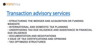 Transaction advisory services are increasingly important in the context of global mergers and acquisitions as strategies for growth and consolidation. The document highlights the growing relevance of start-up funding and related transactions, emphasizing Transprice's role in providing comprehensive advisory services for both buy-side and sell-side mandates. Key offerings include tax planning, due diligence, and documentation assistance.