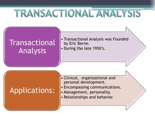 Transactional analysis was founded by Eric Berne in the late 1950s. It is effectively a language within a language that helps understand communication patterns between people. There are three ego states - Parent, Adult, and Child - that represent different thought and behavior patterns. Effective communication occurs through complementary transactions when different ego states respond appropriately to each other. Ineffective communication happens through crossed or ulterior transactions when unexpected responses activate inappropriate ego states. Modern transactional analysis expanded the model to seven elements to better analyze interpersonal dynamics.