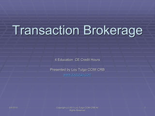 This document discusses transaction brokerage and agency relationships in real estate. It begins with background on how brokerage relationships have evolved from caveat emptor to requirements for consumer protection. It then discusses key questions about what agency and transaction brokerage entail and the different types of brokerage relationships like exclusive agency and facilitation. The document also covers how different states approach agency, whether it is assumed or must be chosen, and the duties involved in various brokerage relationships.