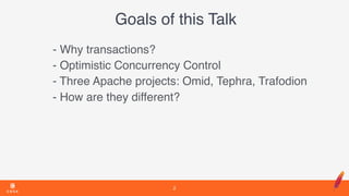 The document discusses transaction mechanisms in HBase, focusing on optimistic concurrency control and three Apache projects: Omid, Tephra, and Trafodion, each differing in their implementation. It highlights the importance of data consistency in NoSQL environments, describing the ACID properties necessary for reliable transactions. The talk covers the lifecycle of transactions, conflict detection, and the unique features of each Apache project, emphasizing the evolution and scalability of these systems.