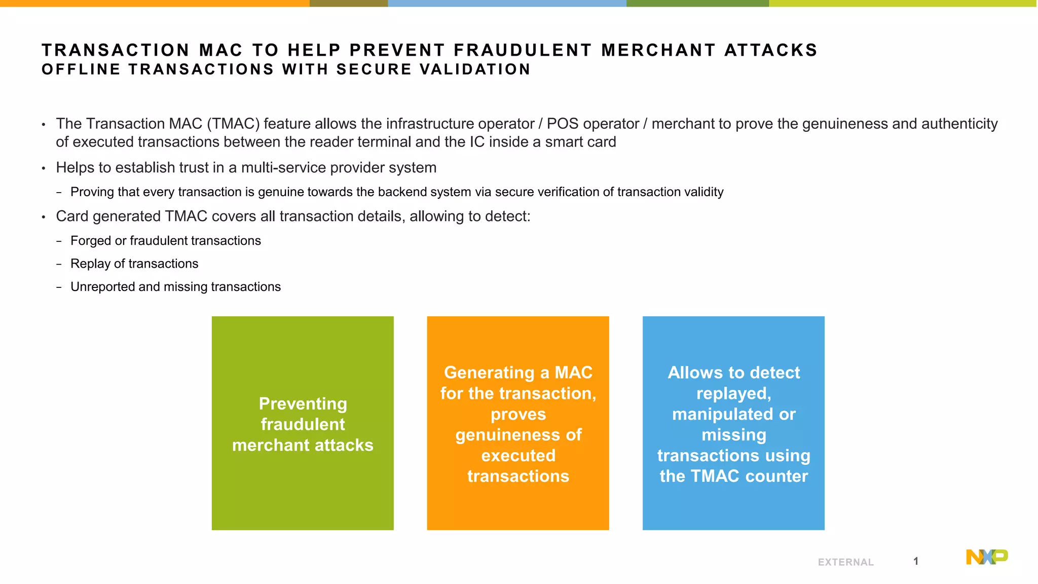 The Transaction MAC (TMAC) feature allows smart cards like MIFARE DESFire EV3 and MIFARE Plus EV2 to generate a message authentication code (MAC) for offline transactions between a reader terminal and the smart card. The TMAC helps establish trust by proving the authenticity and validity of transactions when reported to the backend system. It can detect fraudulent activities like replayed, forged, manipulated, or missing transactions by verifying the MAC covers all transaction details and is generated with a secure TMAC key. Technical details are provided on how to enable and use the TMAC feature for different applications and data blocks on each card.