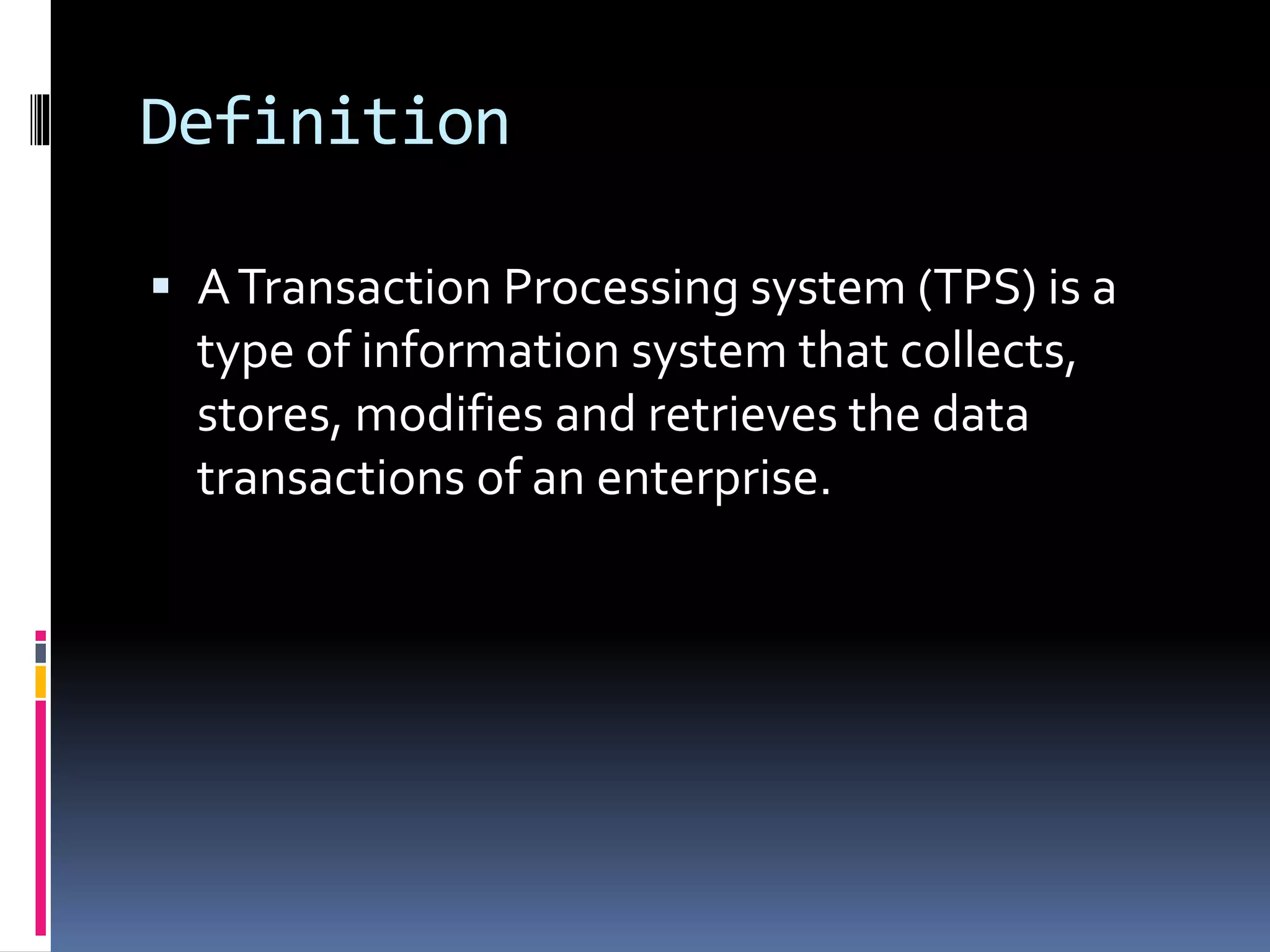 A transaction processing system (TPS) collects, stores, modifies, and retrieves data about business transactions. It must pass the ACID test, ensuring atomicity, consistency, isolation, and durability of transactions. There are two types - batch processing, where data is collected and processed periodically, and real-time processing, where data is processed immediately. The transaction processing cycle involves data entry, processing transactions, maintaining databases, generating documents and reports, and allowing for inquiries. The overall purpose is to keep records of the organization, process transactions that affect those records, and produce reports.