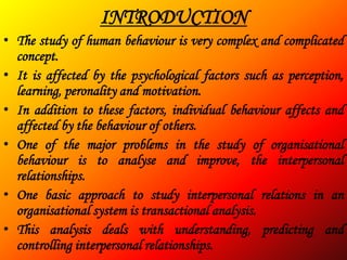 Transactional analysis is a technique used to understand interpersonal relationships and behavior, especially in organizations. It was introduced by Eric Berne and views personality and dynamics through ego states (parent, adult, child) and transactions between individuals. Key concepts include analysis of self-awareness using the Johari window model, understanding ego states and how they influence transactions, analyzing communication patterns and "games" people play, and identifying core beliefs about self and others through life positions and use of recognition ("stroking"). The goal is improved self-understanding and interpersonal relationships.