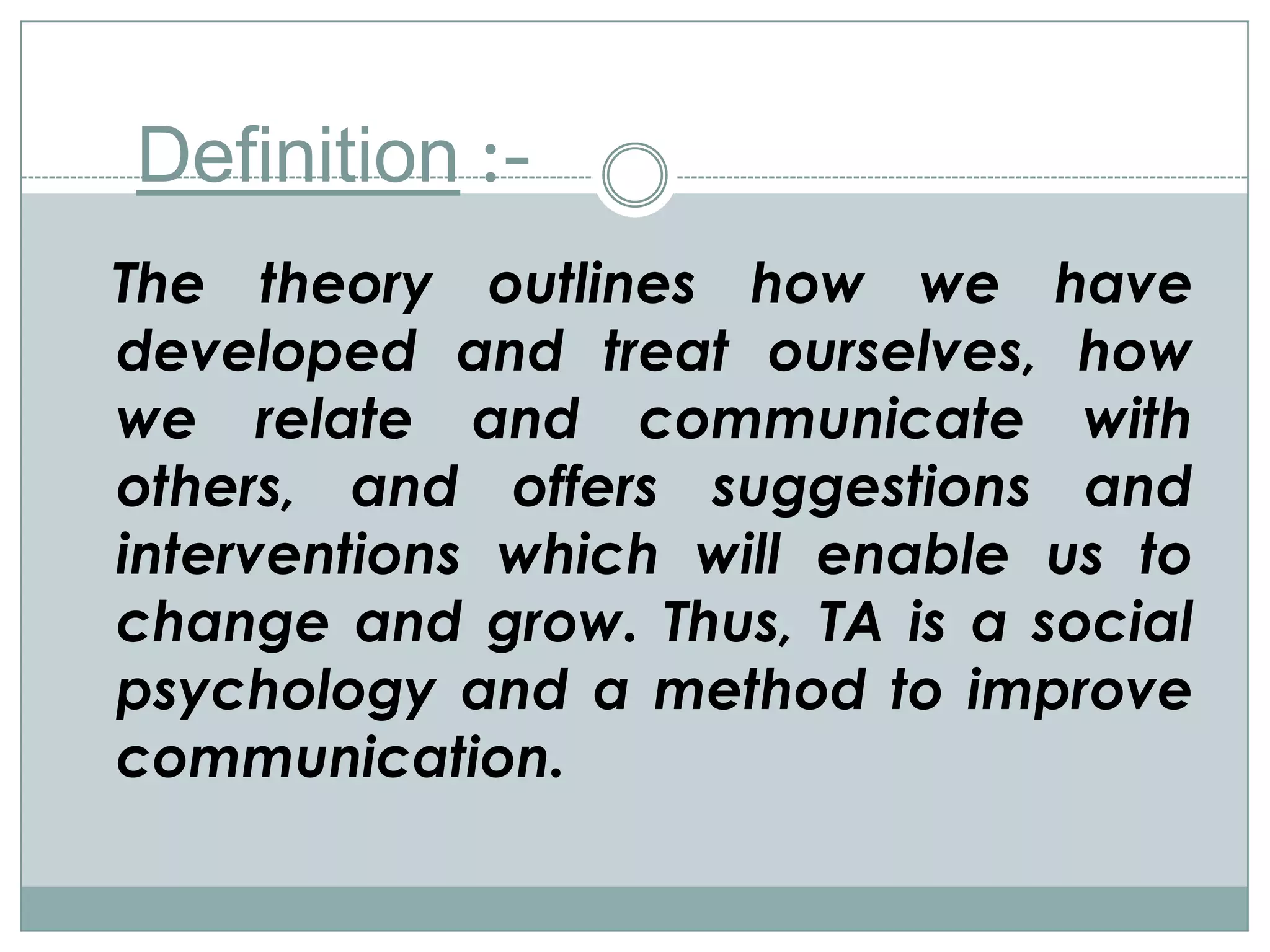 The document discusses Transactional Analysis (TA), a social psychology theory developed by Eric Berne in the 1950s, which explains how individuals develop and communicate through three ego states: Parent, Adult, and Child. It highlights the significance of ego states in communication, the types of transactions that occur between people, and the concept of life positions that influence behavior. TA aims to improve interpersonal relationships, facilitate team building, and enhance organizational behavior by fostering autonomy, spontaneity, and effective problem solving.