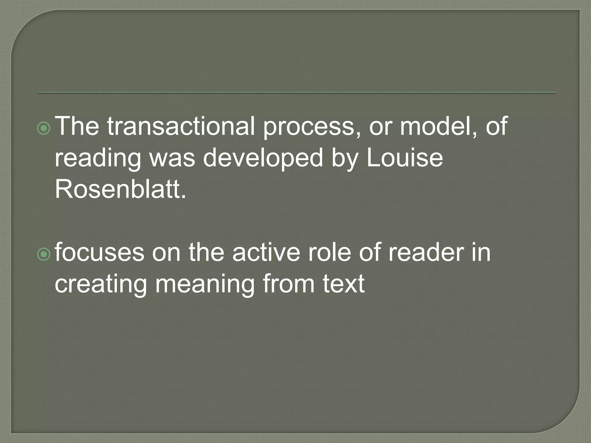 The transactional process of reading developed by Louise Rosenblatt focuses on the active role of readers in creating meaning from text. It emphasizes that meaning is created through an interaction between the reader and the text based on the reader's own experiences and language skills. Multiple interpretations of a single text are possible from this perspective.