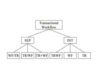 This document discusses transactional workflows from both a conceptual and language perspective. Conceptually, transactional workflows can be modeled either as separate transaction and workflow models combined, or as a single integrated transactional workflow model. From a language perspective, transactional workflows can be specified using separate transaction definition and workflow definition languages, or an integrated transactional workflow definition language. The document outlines different approaches to relating these models and languages and the advantages of using transactional workflows.
