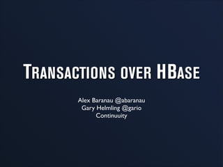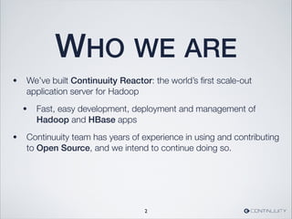 The document discusses Continuuity Reactor, a scale-out application server for Hadoop that facilitates fast and reliable development and management of Hadoop and HBase applications. It explains the concepts of transactions in stream processing, including their atomicity, consistency, isolation, and durability, as well as the implementation of Omid-style transactions and the role of a transaction manager. The document also highlights transaction lifecycle management, conflict resolution, and the importance of transaction cleanup within HBase systems.