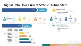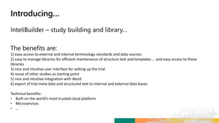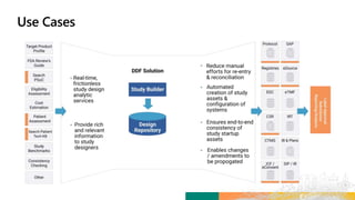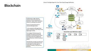 TransCelerate held a hackathon to demonstrate a digital clinical study design platform that can build a global clinical study protocol in 3 minutes. The agenda included an interactive demonstration of the platform and user guides. The platform uses blockchain technology to provide transparency and visibility into the clinical trial process for all stakeholders. This allows for near real-time sharing of study protocols, amendments, and reports to accelerate drug development.