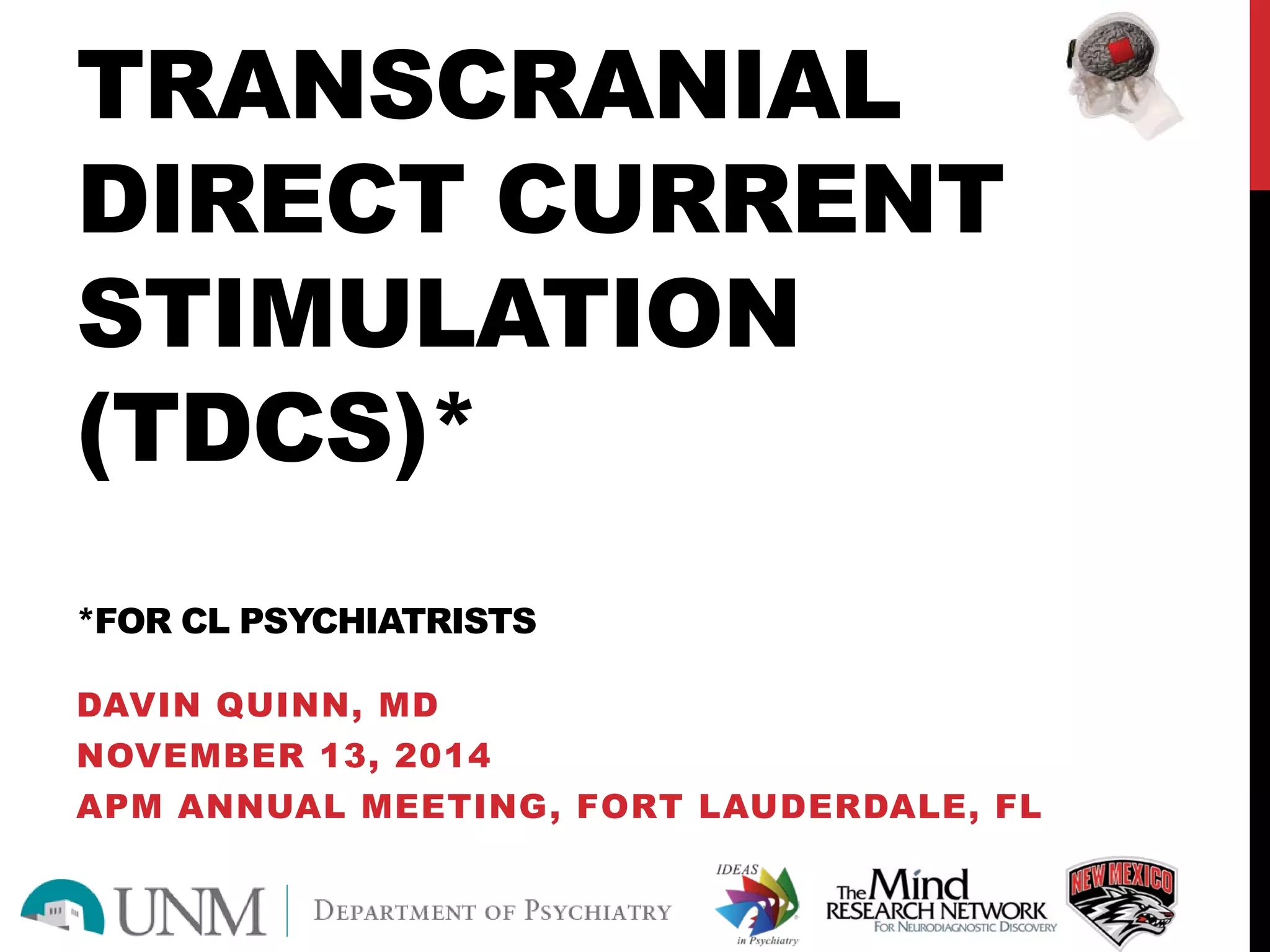 Transracial direct current stimulation (tDCS) is a non-invasive form of brain stimulation that delivers low currents of electricity to modulate neuronal activity. It has been studied as a treatment for conditions such as depression, stroke rehabilitation and cognitive impairment. While generally safe with minor side effects like skin irritation and fatigue, more research is still needed on its efficacy and long term effects before it can be recommended in clinical practice. tDCS holds promise as a treatment to induce neuroplasticity but requires further evaluation in controlled trials.