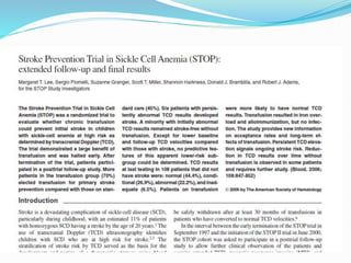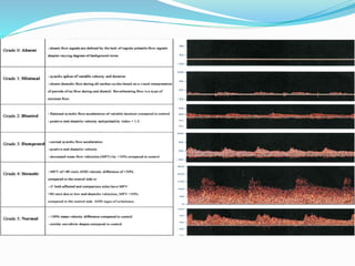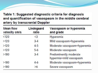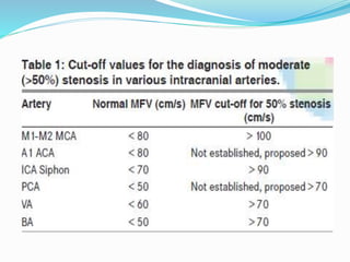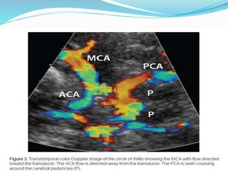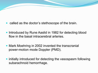 Trans-cranial Doppler (TCD) ultrasonography is used to evaluate blood flow velocities in the basal intracerebral arteries. It was introduced in 1982 and has since been used for applications like detecting vasospasm after subarachnoid hemorrhage, monitoring stroke risk in sickle cell disease, and as a supplementary test for confirming brain death. TCD uses acoustic windows to insonate arteries like the middle cerebral artery, assessing flow parameters like peak systolic velocity to evaluate stenosis or vasomotor reactivity. It can also detect embolic signals and changes in flow patterns associated with conditions like atrial fibrillation or cerebral circulatory arrest.
