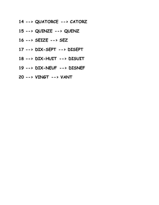 This document provides the French pronunciation for numbers 1 through 20. It lists each number in French, followed by its phonetic transcription. For example, 1 is "un" pronounced as "an", 2 is "deux" pronounced as "doe", and 20 is "vingt" pronounced as "vant". The phonetic spellings help illustrate how to correctly say the numbers with French pronunciation.