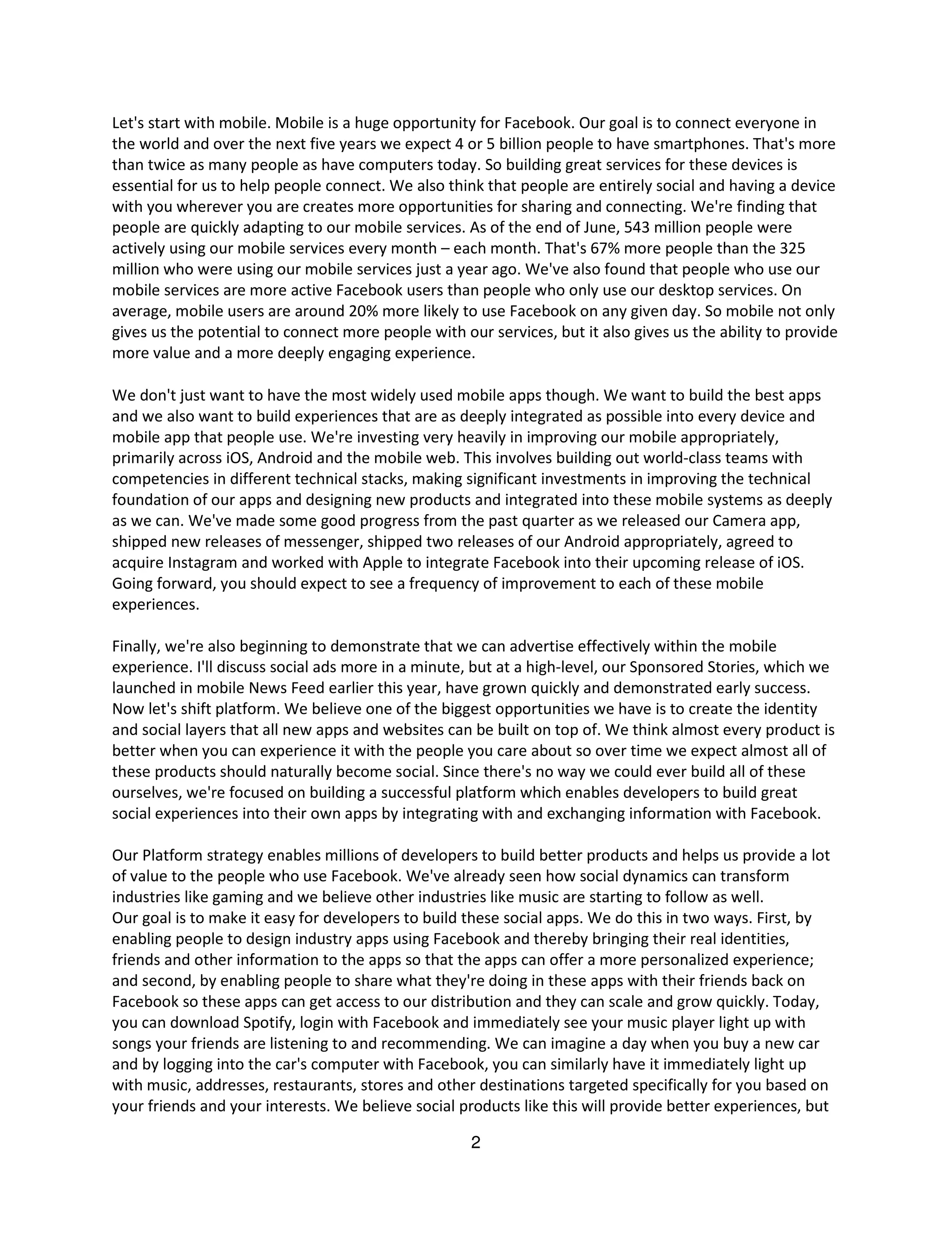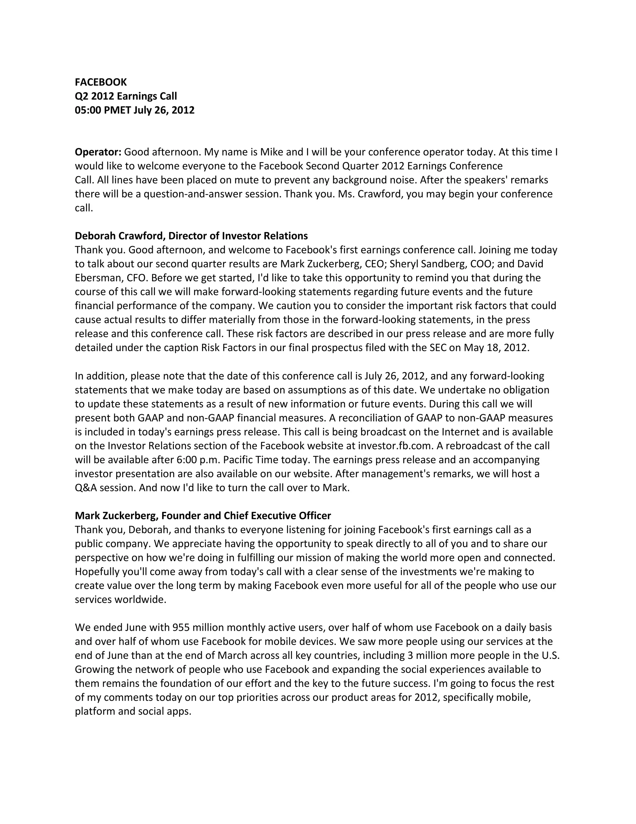 Facebook held its first earnings call on July 26, 2012 to discuss its Q2 2012 results. The operator opened the call by welcoming participants. Deborah Crawford, Director of Investor Relations, then reminded participants about forward-looking statements and provided an overview of the call. Mark Zuckerberg, Facebook's CEO, focused his remarks on the company's top priorities of mobile, platform, and social apps to fulfill its mission of connecting people worldwide.