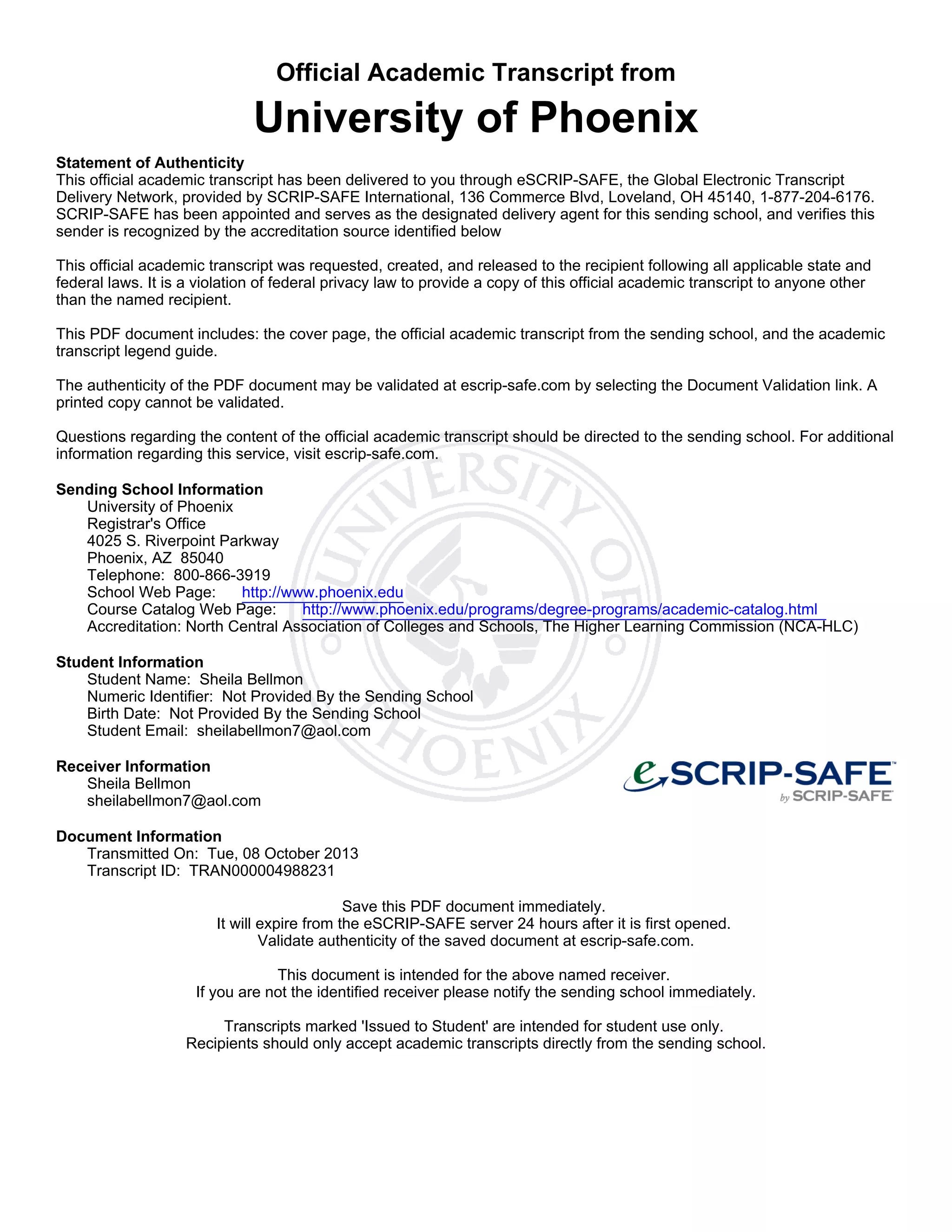 The document is an official academic transcript from the University of Phoenix sent to Sheila Bellmon. It summarizes her coursework and degree earned. It shows that Sheila completed 81 credits at University of Phoenix between 2006-2010, earning a Bachelor of Science in Business/Administration degree in March 2010 with a cumulative GPA of 3.26. The transcript is verified as authentic through the eSCRIP-SAFE electronic delivery system and contains information about the school and policies for interpreting the transcript.