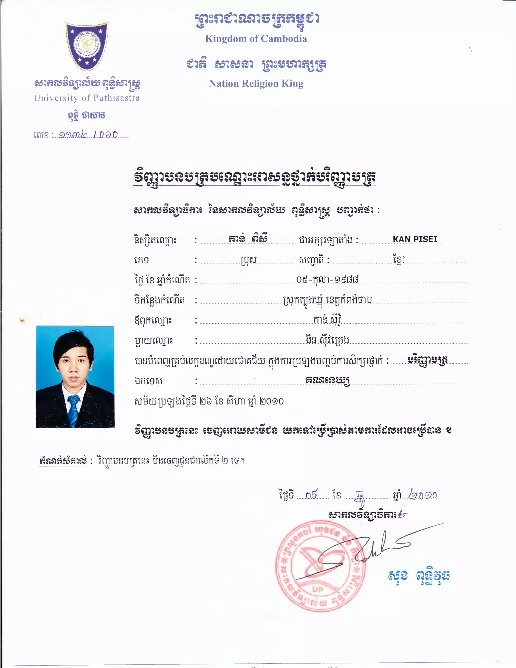 This academic transcript is for a student named Kan Pisei who graduated from the University of Puthisastra in Cambodia in 2010 with a Bachelor's Degree in Accounting. Over four years of study, Kan earned 135 credits with a grade point average of 3.28. His coursework included subjects like English, history, mathematics, economics, law, accounting, finance, marketing and business. He received grades ranging from A to C+ across his subjects. The transcript is certified by the university president as an official academic record.