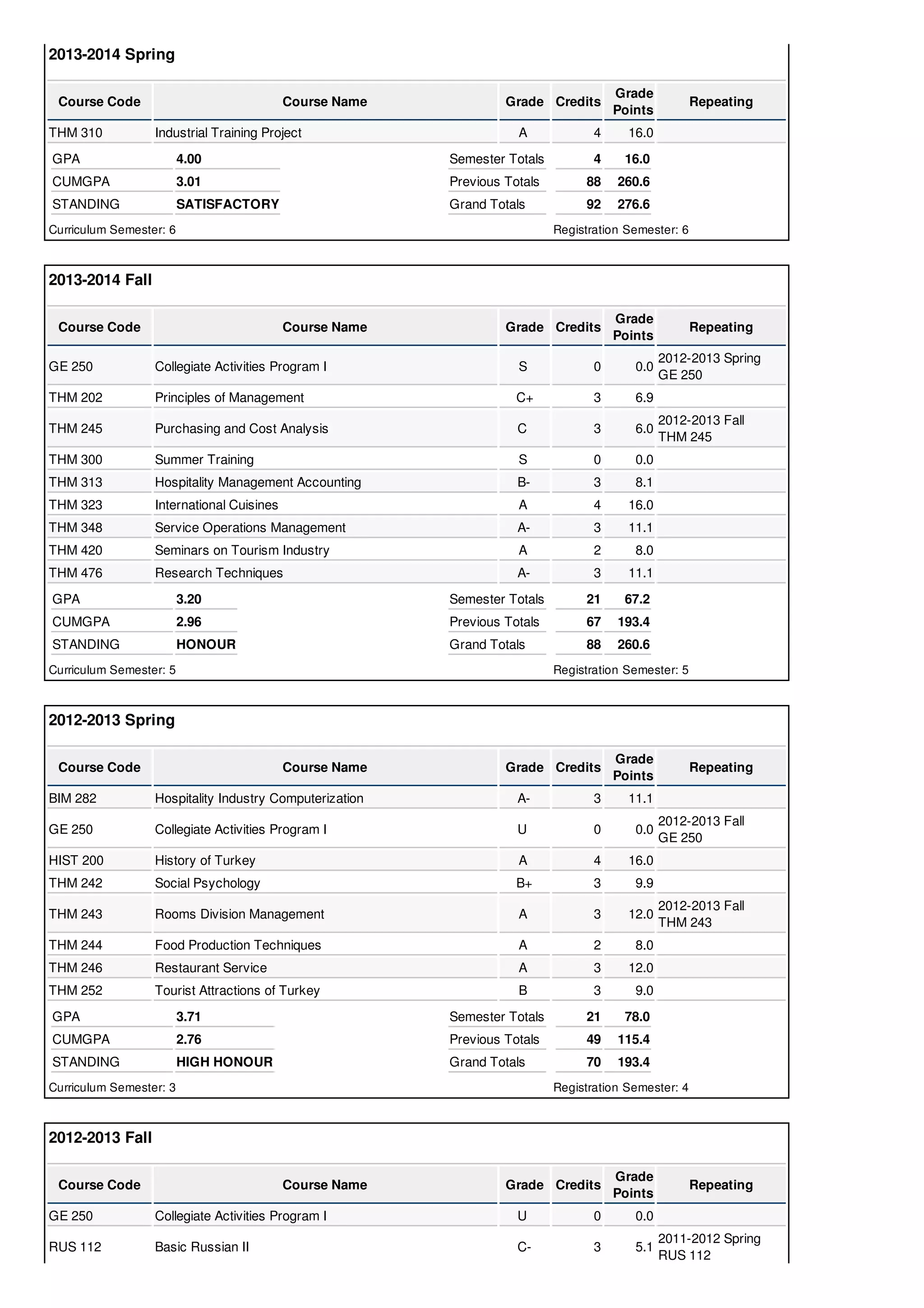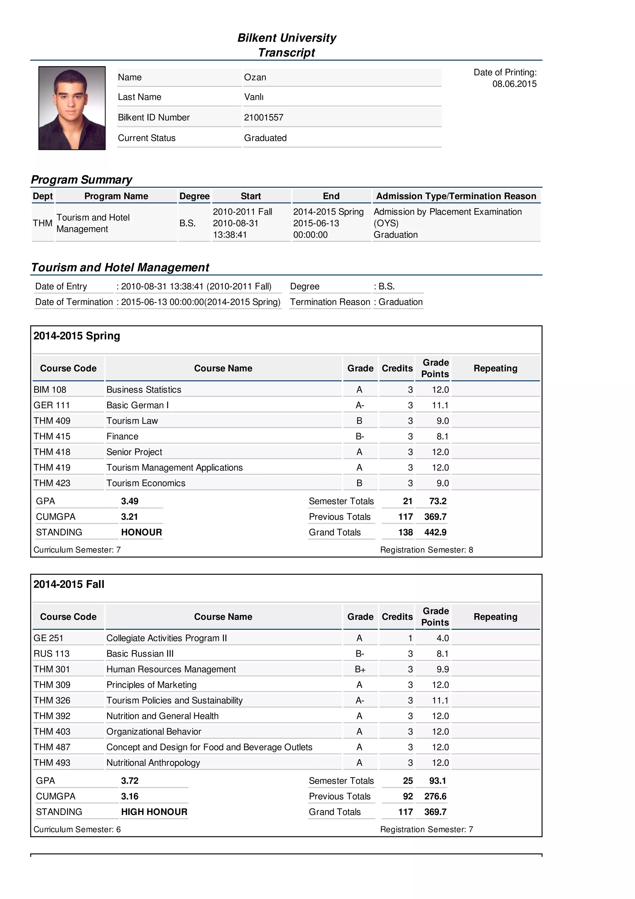 This transcript summarizes the academic record of Ozan Vanlı, including their grades, GPAs, academic standing, courses taken, and degree information for their B.S. in Tourism and Hotel Management at Bilkent University from 2010-2015. It shows they maintained high or honour standing throughout, with GPAs ranging from 3.16 to 4.00. Their final GPA upon graduation was 3.16.