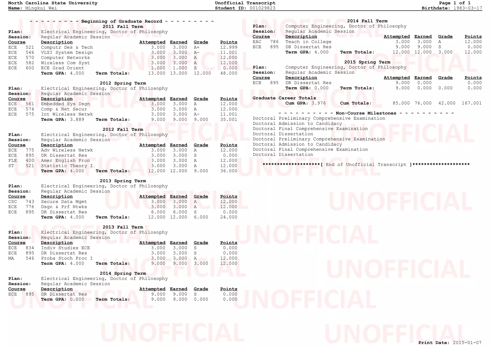 Mingkui Wei attended North Carolina State University from 2011-2015 where he pursued a PhD in Electrical Engineering. Over the course of his graduate studies, he maintained a cumulative GPA of 3.976 and earned 167.001 grade points by completing 76 credit hours with a variety of technical and research courses related to his field. His transcript shows that he successfully completed preliminary and final comprehensive exams, was admitted to candidacy for his doctoral degree, and conducted dissertation research.