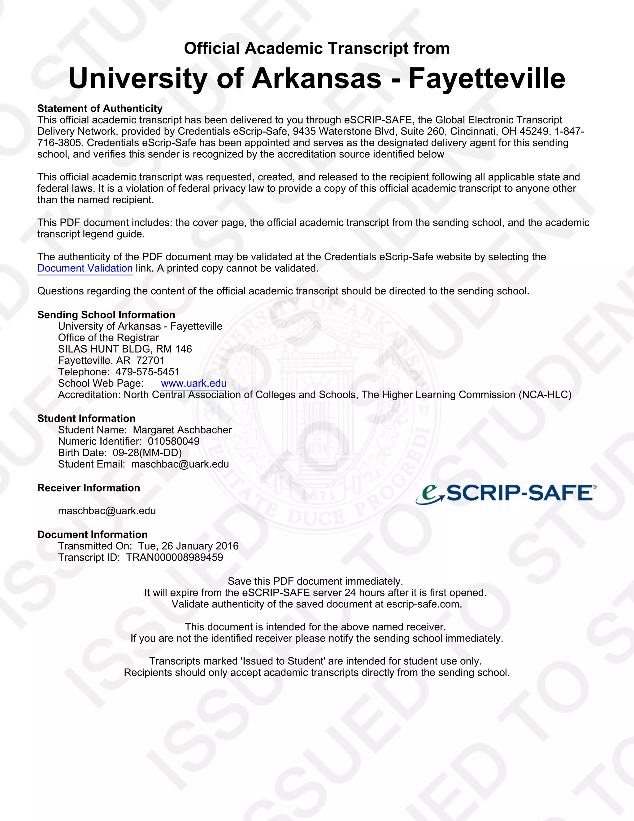 This document is an official academic transcript from the University of Arkansas - Fayetteville for Margaret Aschbacher. It details her undergraduate education, where she earned a Bachelor of Science in Education in 2015, as well as some of her graduate coursework. The transcript provides information on the courses taken each semester, grades received, grade point averages, transfer credits, and degrees awarded. It was delivered electronically through a secure transcript delivery service and can be validated on their website to confirm its authenticity.