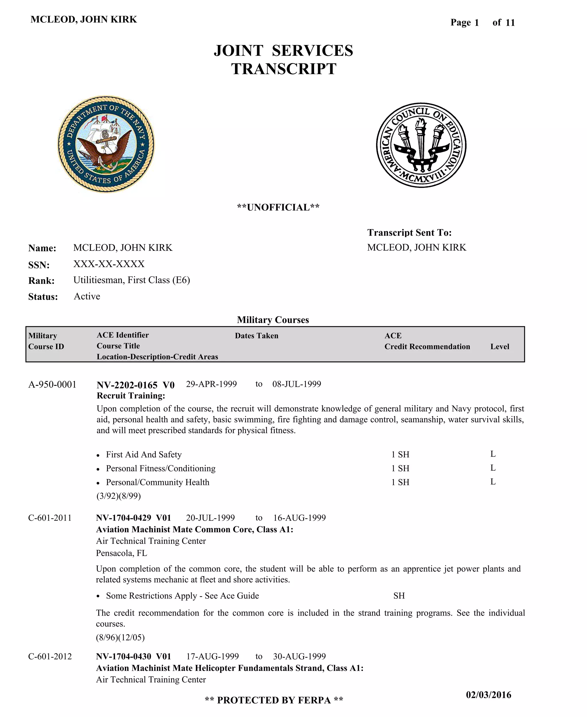 John Kirk McLeod served in the Navy as an Aviation Machinist's Mate and Utilitiesman. His transcript shows that he completed training in areas such as aircraft maintenance, jet engine systems, leadership, plumbing, HVAC, and physics. He held occupations including Airman, Airman Apprentice, and Aviation Machinist's Mate, gaining experience in aircraft maintenance and jet engine maintenance.